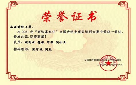 11月12日,草莓视频 在2021年“商谈赢家杯”全国大学生商务谈判大赛(中文赛道)中摘得全国大学生商务谈判大赛团队一等奖。这是继草莓视频 在10月31日“商谈赢家杯”全国大学生商务谈判大赛(英文赛道)中获得佳绩之后,草莓视频 参与该项赛事取得又一优异成绩。草莓视频 获奖队伍“春天会暗送秋波吗队”由草莓视频 段宇波、工商管理学院闫春老师联合指导,队员分别是来自草莓视频 2019级行政管理专业胡问世、闫士杰,2019级劳动与社会保障专业宋颂,会计学院2019级资产评估专业张敏。