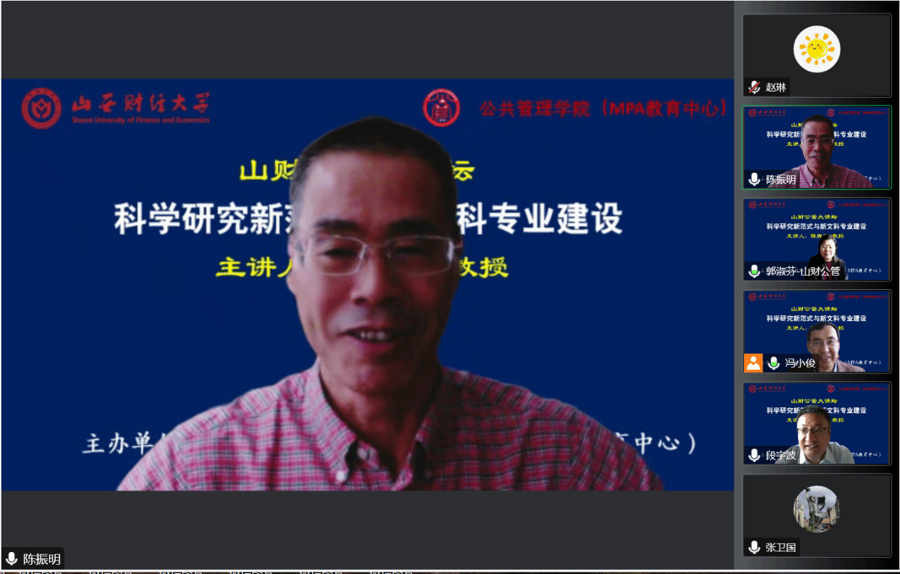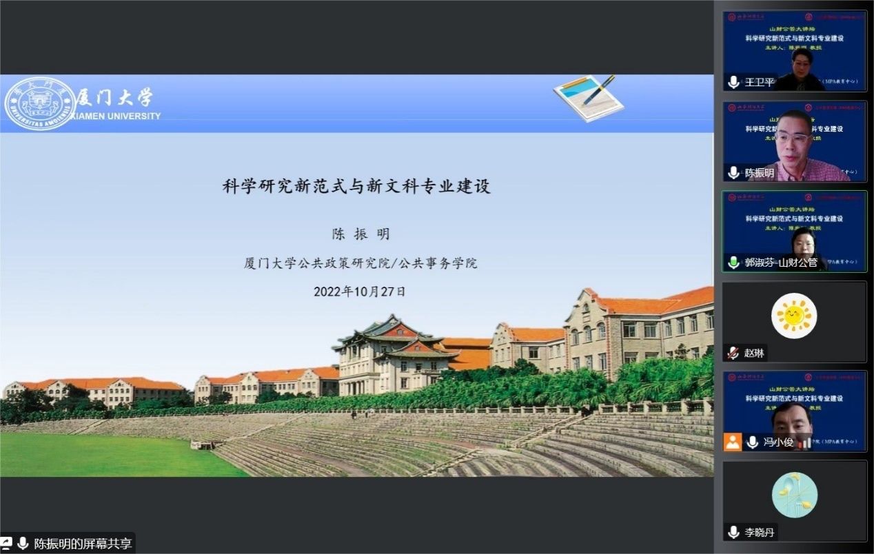 主办的“山财公管大讲坛”正式开讲,厦门大学公共政策研究院教授兼院长、厦门大学社会科学学部主任、“长江学者”特聘教授陈振明拨冗莅临第一讲做了题为“科学研究新范式与新文科专业建设”的报告。校党委副书记、公共管理一级学科带头人王卫平教授主持了本次大讲坛。来自校内外的300余名师生线上聆听了报告。