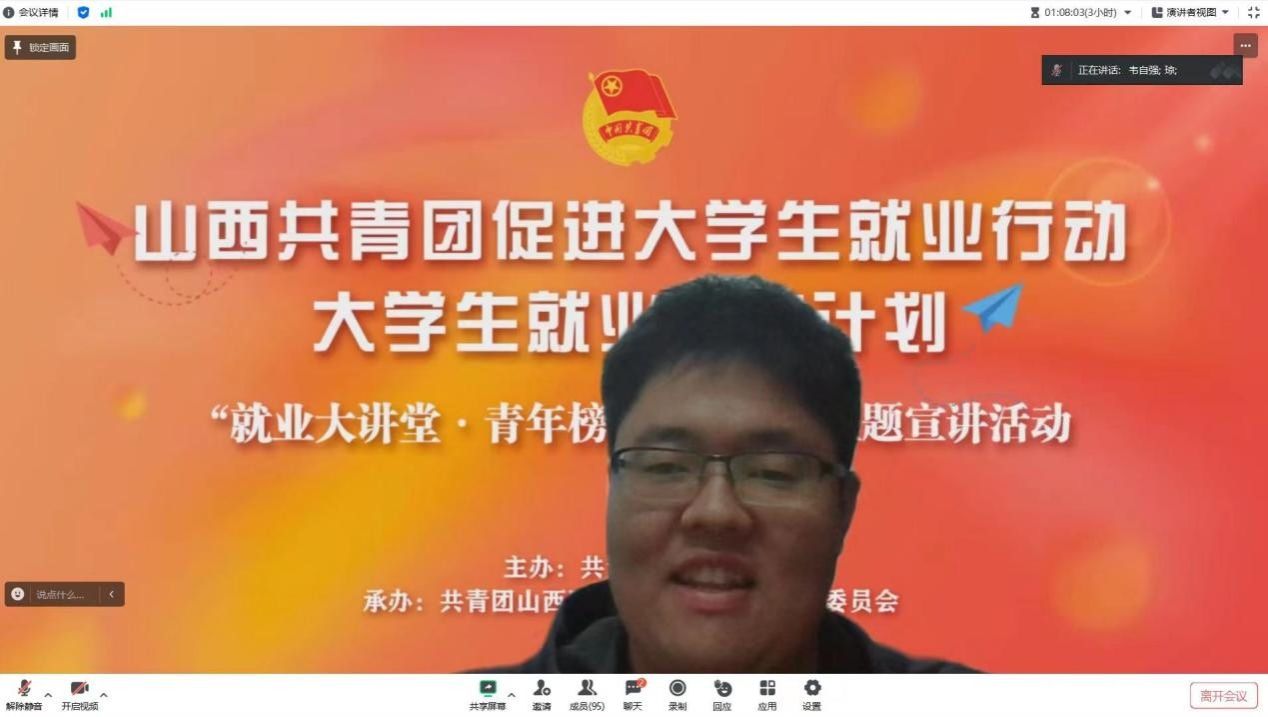 团委以线上腾讯会议形式组织开展“就业大讲堂·青年榜样进校园”主题宣讲活动。本次宣讲活动特邀2022年度优秀毕业研究生陈力和2023优秀毕业本科生韦自强作为分享人,会议由团委书记王琼主持,各团支部代表踊跃参加。