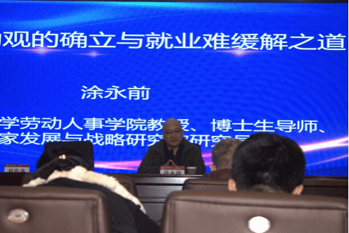 主旨报告阶段,由刘海燕副院长主持,三位专家依次进行了报告。第一位报告人是中国人民大学劳动人事学院教授、博士生导师、国家发展与战略研究院研究员涂永前博士。他以“正确劳动观的确立与就业难缓解之道”为主题,深入剖析了各群体就业问题,提出了以职业技能、应用培养为导向的劳动教育理念,旨在转变大学生就业观念,减少职业刻板印象的影响,实现工作与生活的和谐平衡。