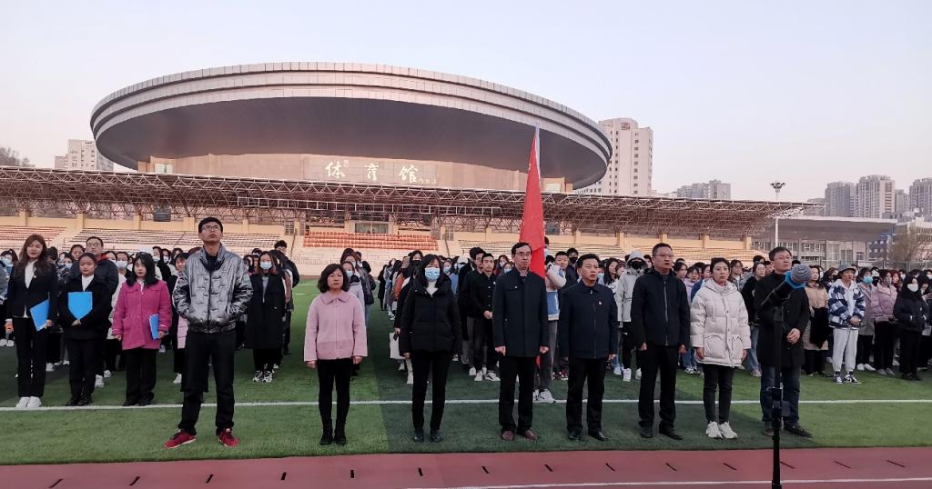 在坞城校区体育场举行“不忘峥嵘岁月,咏唱百年辉煌”主题升旗仪式,学院党政班子成员、全体辅导员和在校学生参加了仪式。