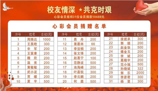 以爱之名,共克时艰。校友们铭记“修德立信、博学求真”的校训精神,他们的慷慨捐赠,凝聚了对母校的深深感恩与感激,凝聚了对母校的浓浓情谊和祝愿。