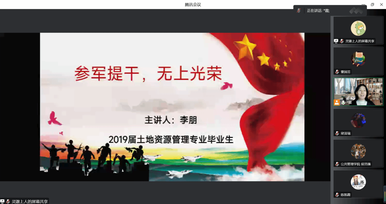 于2022年12月5日晚在腾讯会议举办了“朋辈引领话就业”就业分享会,会议邀请了2019届土地资源管理专业毕业生、现某部队军官李朋和2022届研究生毕业生陈力做主题讲座,李霞老师主持。